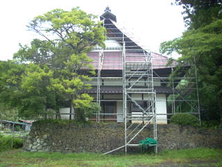 寺院屋根葺き替え工事リフォーム・リノベーションの現場 2020.07.28 2011.08.30 上田市室賀のお寺さんで、屋根の葺き替え工事を行っています。 現在の鉄板ぶきから、銅板屋根になります。 仮設足場を設置。 足場設置後、軒裏のトタン下地の撤去から行いました。雨天の日も多く足元も滑りますので、慎重に作業を行う必要があります。 職人の方々、安全第一でお願いします。