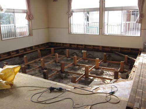 保育園の床修繕学校・園 2022.09.30 2015.03.233歳未満児のお子様を預かり保育する部屋の、床改修工事です。 一段高いステージ状の床の段差が、つまづき等の原因となっていたため撤去し、他の床とフラットにしました。施工前カーペットを外して、床も段差を無くすために取り外します。その後、新たな床を張っていきます。カーペットは、汚れやキズ等が生じたときに、部分的に張り替えができるよう、タイルカーペットでの施工です。きれいに隙間なくカーペットを設置して完成です。既存の床とのわずかな段差のある境目は、安全性を考え金属製の金物を避け、柔らかい樹脂製スロープ状の段差解消材を使用しました。