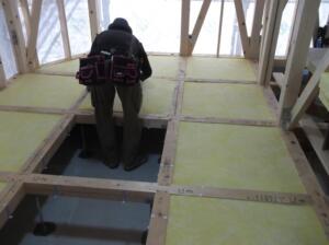 ↑壁に断熱材を設置した後、下地材のプラスターボードを張っています。