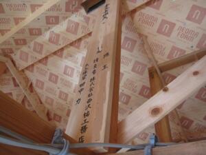 佐久市 新築工事現場 WB工法の換気口工事など新築・注文住宅の現場 2022.09.24 2022.05.20佐久市の新築工事現場です。 通気断熱WB工法のお宅です。 ↑屋根裏には上棟式にお施主様に書いていただいた、棟札とお飾りが掲げられています。 ↑屋根に抜けるWB工法の換気口が大工さんによって設置されています。 ↑瑕疵担保保険のJIOの検査員さんに、外装防水検査をしてもらいまいした。 ↑外壁の下地板張りが終わった様子です。