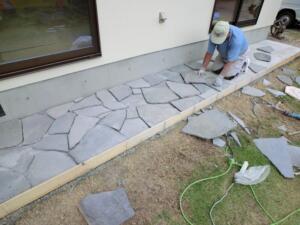 犬走りにも鉄平石を敷きますが、どのように設置するか石を調整しながら仮に並べます。