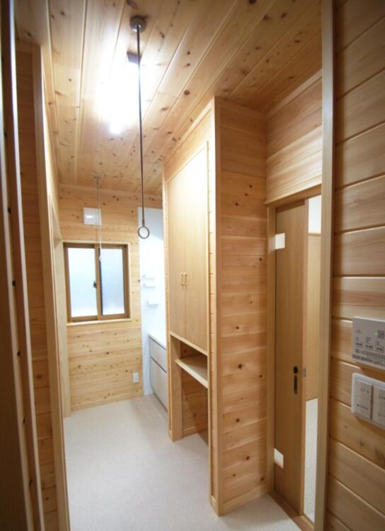 キッチン側からもリビング側からも出入りできる洗面室は室内干しもでき、タオルや下着なども収納できると棚も完備。階段下に洗濯機を設置しました。洗面室とトイレにも床暖房があり冬でも暖かです。