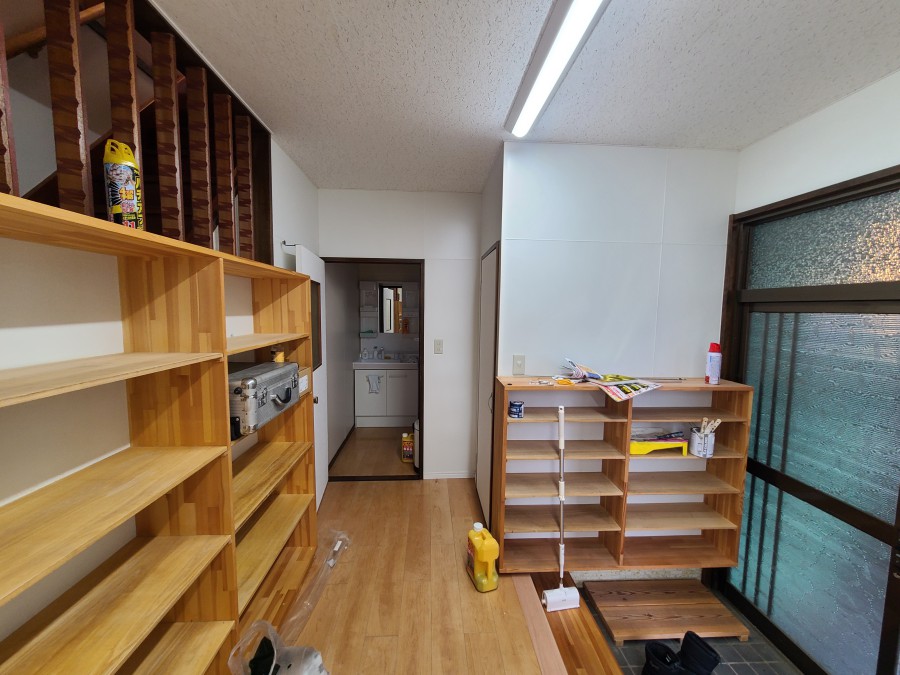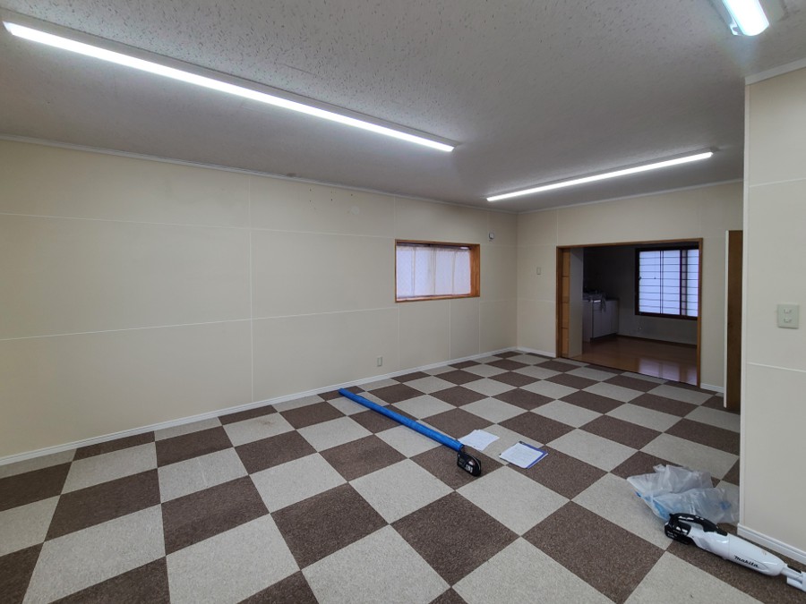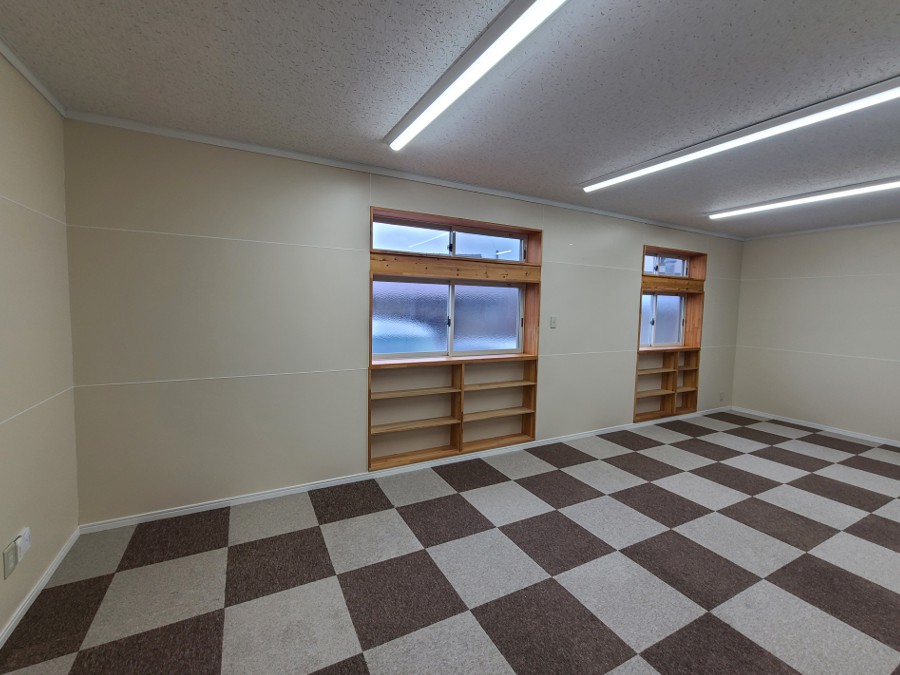 カーペットは撤去し、全身鏡を設置する為の下地作りを行い、一部の窓は塞いでOSBボードを仕上げに使用し掲示パネルへ。